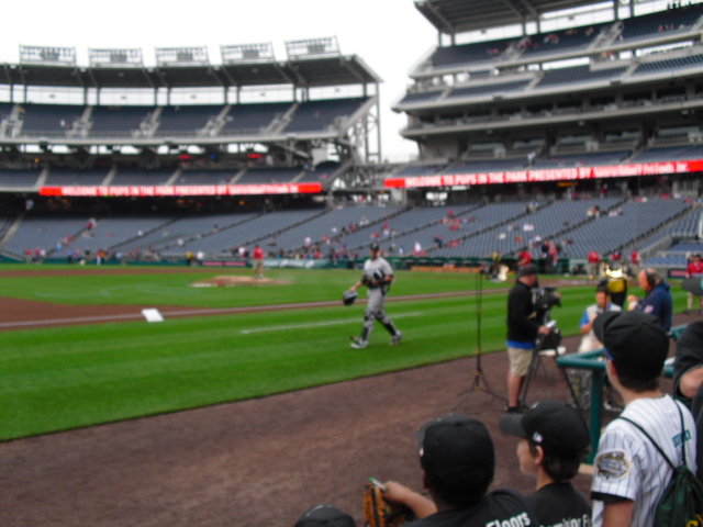 It was pups in the park promotion day in D.C., so at about noon, a parade of dogs and dog owners sauntered around the perimeter of the field. Throughout the hour leading up to the game, Craig Minervini gave his pre-game analysis right outside the dugout. Although I couldn’t understand what he was saying, it was enjoyable anyway. Also, right before the first pitch I saw him right outside the elevators, but he didn’t get on mine.