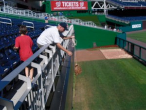 Over the course of the Nationals batting practice, very few balls were thrown into the stands in left field. And when Tom Gorzelanny or Sean Burnett did throw one in, it was to a young kid in the front row. I brought my glove trick to the game, but didn’t use it