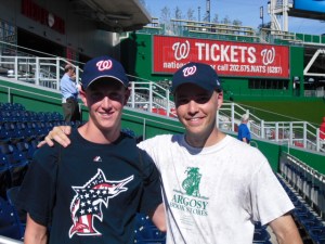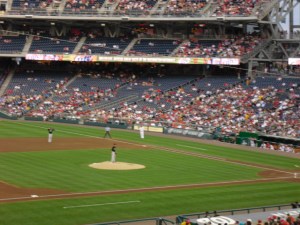 For the entire hour I spent in the car driving home last night I was wondering how in the world I would begin this post. So I guess I’ll just begin with the conundrum I faced in the morning. What to wear? I know, it’s a baseball game, I don’t have to worry about matching ties and shoes. But the last couple of times I’ve gone to Nationals Park to see the Marlins, my trip up Half Street has not been fun. The racing presidents roam outside the gates prior to the game and they always meddle with my Marlins attire. Last year my hat was thrown about 90 feet by Teddy Roosevelt…no joke! So I decided to be a master of disguise for this game. I wore my starts and stripes Marlins shirt with a Nationals hat. You’ll see that look in a little bit.