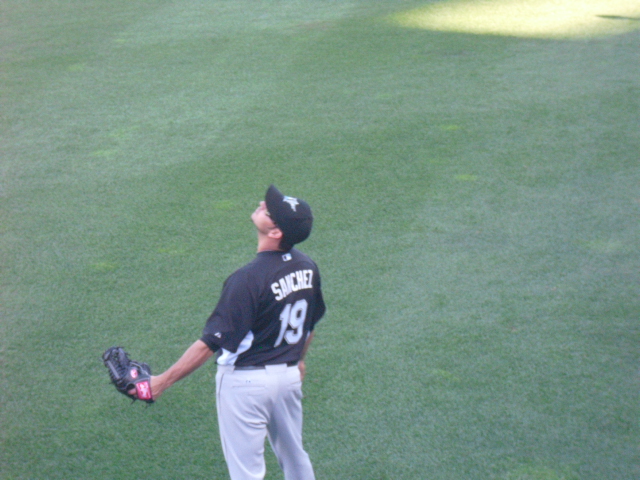 At this point, the Marlins hadn’t started batting yet, but were getting ready. I quickly ran off and changed into my Marlins shirt and sported my teal hat. For some strange reason, I don’t look good in that hat. When they began warming, I went down to the corner where a few Marlins pitchers were congregated. I was just twenty feet from Anibal Sanchez and a few more feet from the rest of the crew.