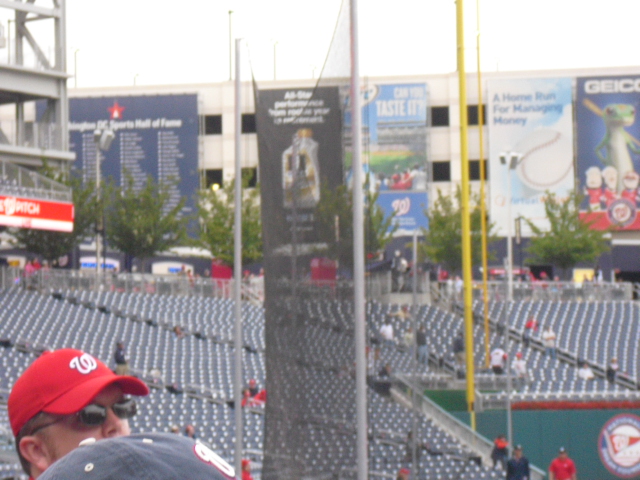 We didn’t have tickets to the game, and box-office tickets are overpriced, so we consulted the “sidewalk entrepreneurs,” the euphemistic term for scalpers, and spent $20 each for tickets in right field. On my own fault, I overpaid. The scalper said the tickets were for section 139, and I thought 139 was a field-level section along the foul line, but I was two or three sections off. Instead, 139 is right on top of the Nationals’ bullpen, and underneath another section. As a result, you cannot see the jumbotron, and it would take a straight line drive for a home run to reach the section.