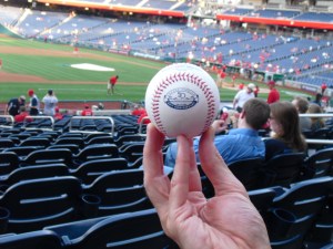 -With another right-handed slugger batting (probably Morse or Werth, but I don’t recall), a deep drive was launched toward the Porch. I had underestimated the distance of several previous blasts, but I overcompensated for this one. I drifted to the back row of the porch, but soon realized the ball would land short. It landed in a seat, and since the seat bottoms on the Red Porch are cushioned, the ball stuck. I ran over and grabbed it (number five).