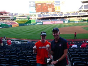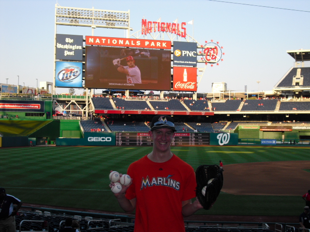 I love tracking at catching batting practice home runs, so my plan for the day was to catch as many homers during the Nats’ portion of BP as I could, and then work the Marlins pitchers for toss-ups simply because Miami only uses their commemoratives to throw with, at least on the road.