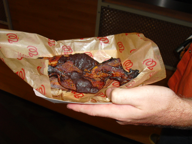 The tarp finally came off the field at around 6:30, and we made our way up to the club level where I noticed a unique item at one of the concession stands: chocolate bacon. It sounded more like a novelty at the Texas state fair than a ballpark snack. Justin bought it with a “why not?” philosophy. The bacon was cold and thick, and the chocolate was frozen on top. There was also a strange spice on the meat that added a kick, contrasting the sweet chocolate. It was weird.