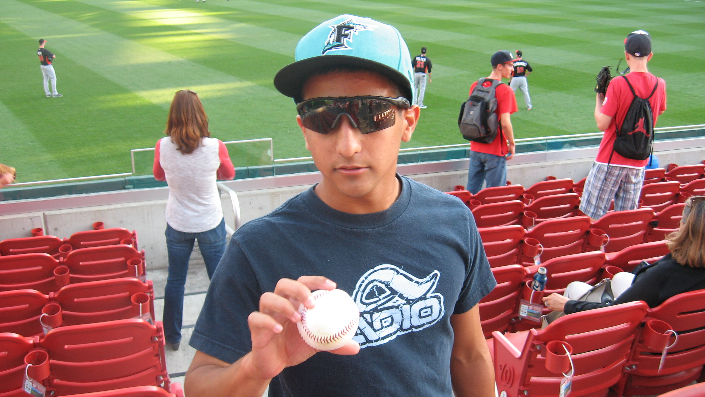Another opportunity presented itself a bit later when Henderson Alvarez chased down a fly ball right in front of the porch. I asked for it in Spanish, and he tossed it into the frenzy of fans in the front row. Luckily, my glove was outstretched farther than anyone’s hands and I had my third ball of the day.