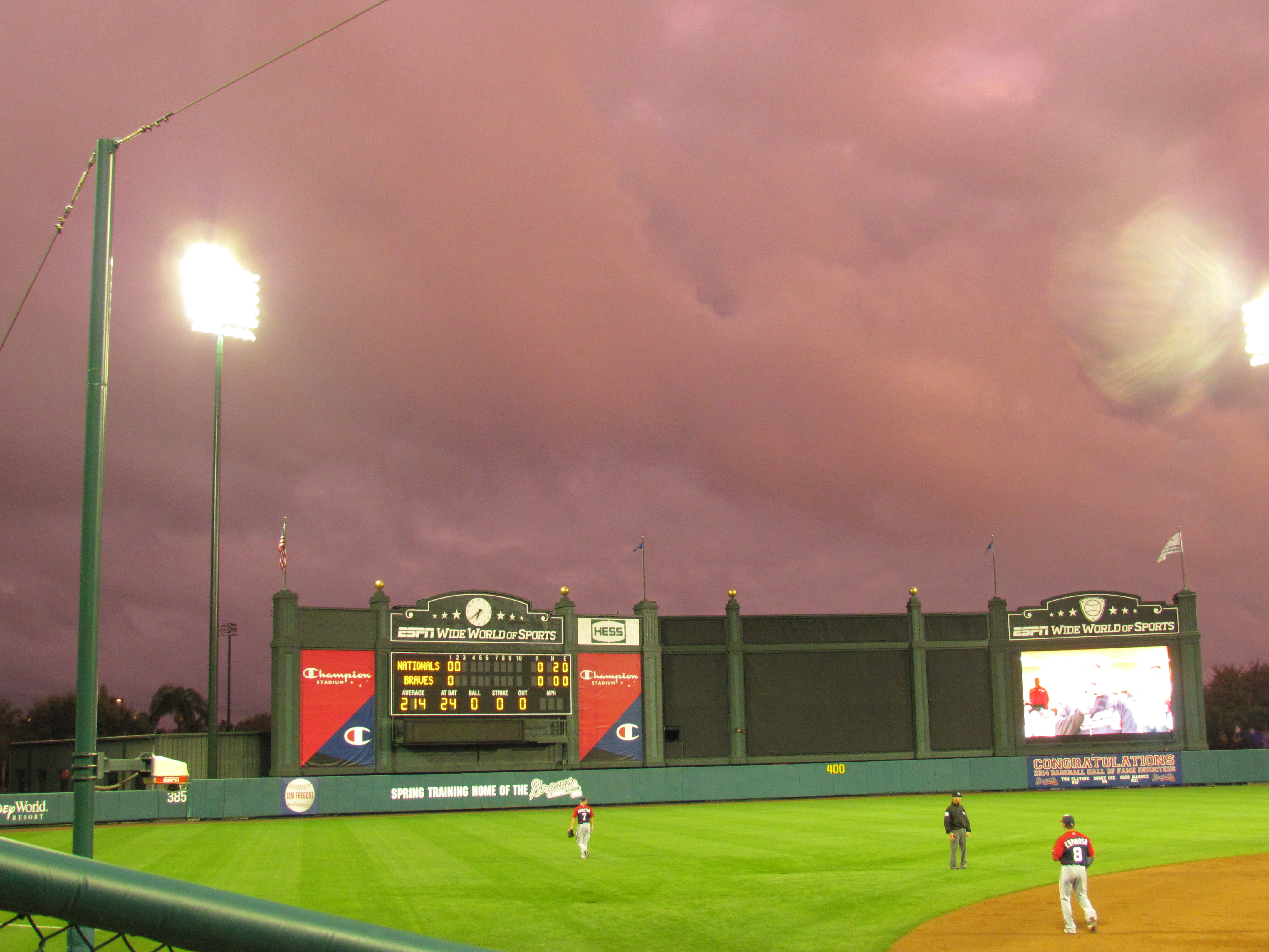 Thunderstorms took hold of Central Florida during the day Thursday, cancelling most Grapefruit League games. But luckily the skies cleared enough for the Nationals and Braves to play an evening game at Disney’s Wide World of Sports. Enjoy these pictures highlighting the night: