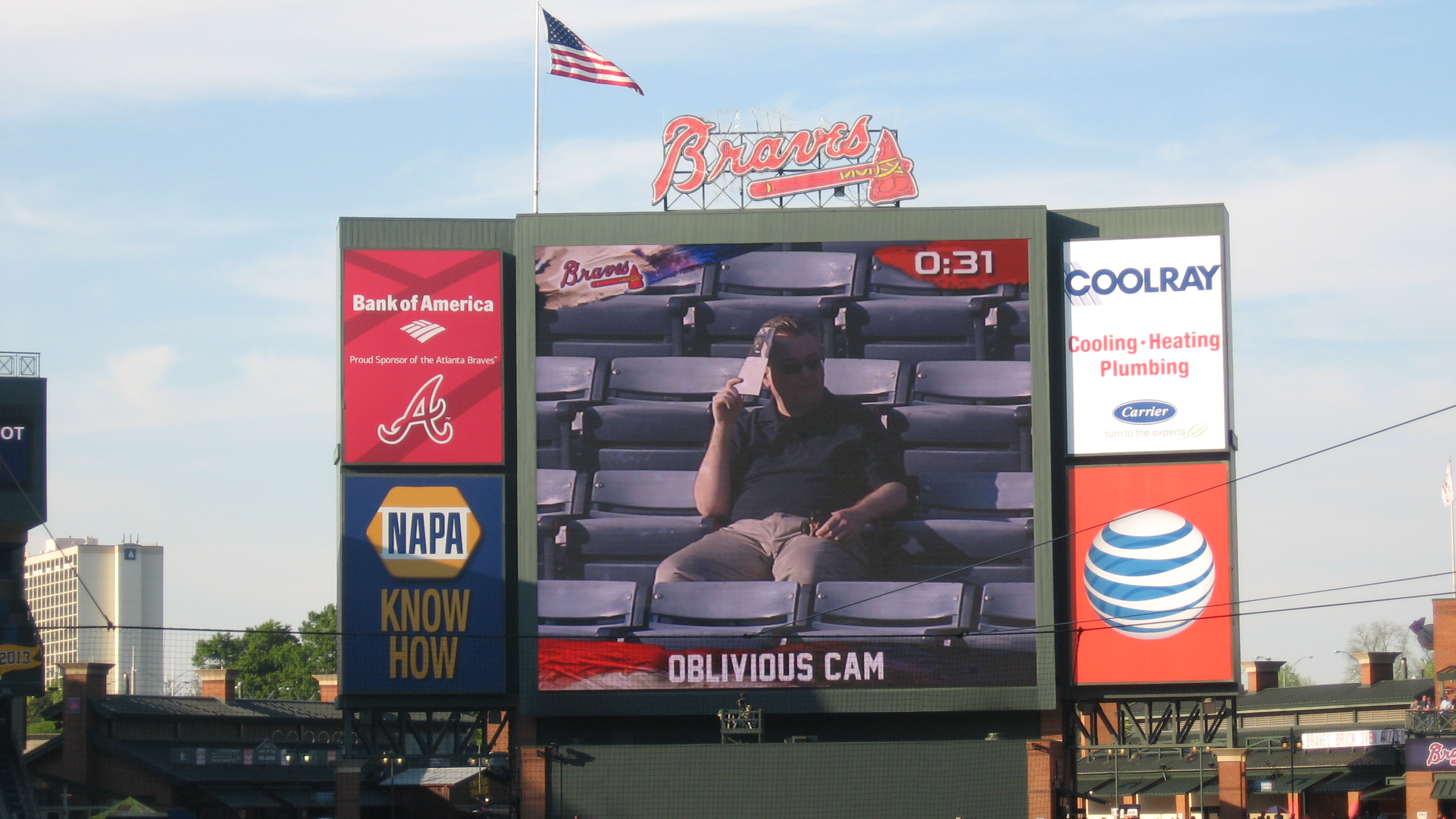 Before the game, the Braves were a bit mean to a few unsuspecting fans. They performed a segment called the “Oblivious Cam” where they put a fan on the jumbotron until he or she noticed they were being shown. However, each fan they chose had their back to the scoreboard, giving them a seriously unfair disadvantage for this disturbing game–if you want to call it that. The first guy was on for about 2 minutes before he noticed. But as I learned first-hand later on, the Braves are not sympathetic towards any disadvantaged spectator.