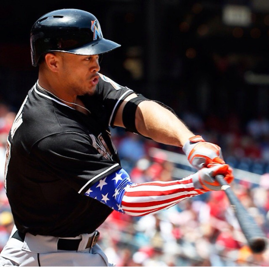 against then-hot Tanner Roark. Stanton mis-hit the ball, he got under it too much. It still traveled 447 feet, off the back wall of Washington’s batters’ eye. Most of the publicity from this bomb came in response to Giancarlo’s patriotic arm sleeve.