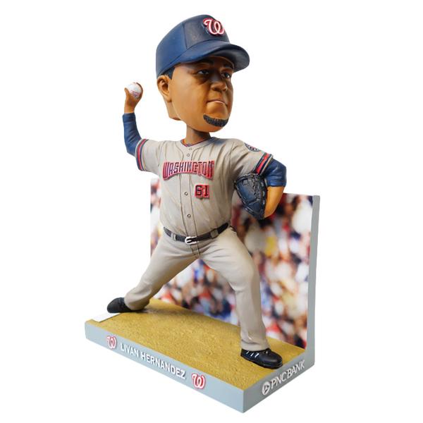 The bobblehead depicts the first pitch in Nationals history, delivered by Hernandez in Citizens Bank Park in Philadelphia on Opening Day in 2005. As such, Hernandez is depicted in the Nats’ away jersey, the first time an away jersey has been featured on a Nationals bobblehead, according to Scott Allen of the Washington Post.
