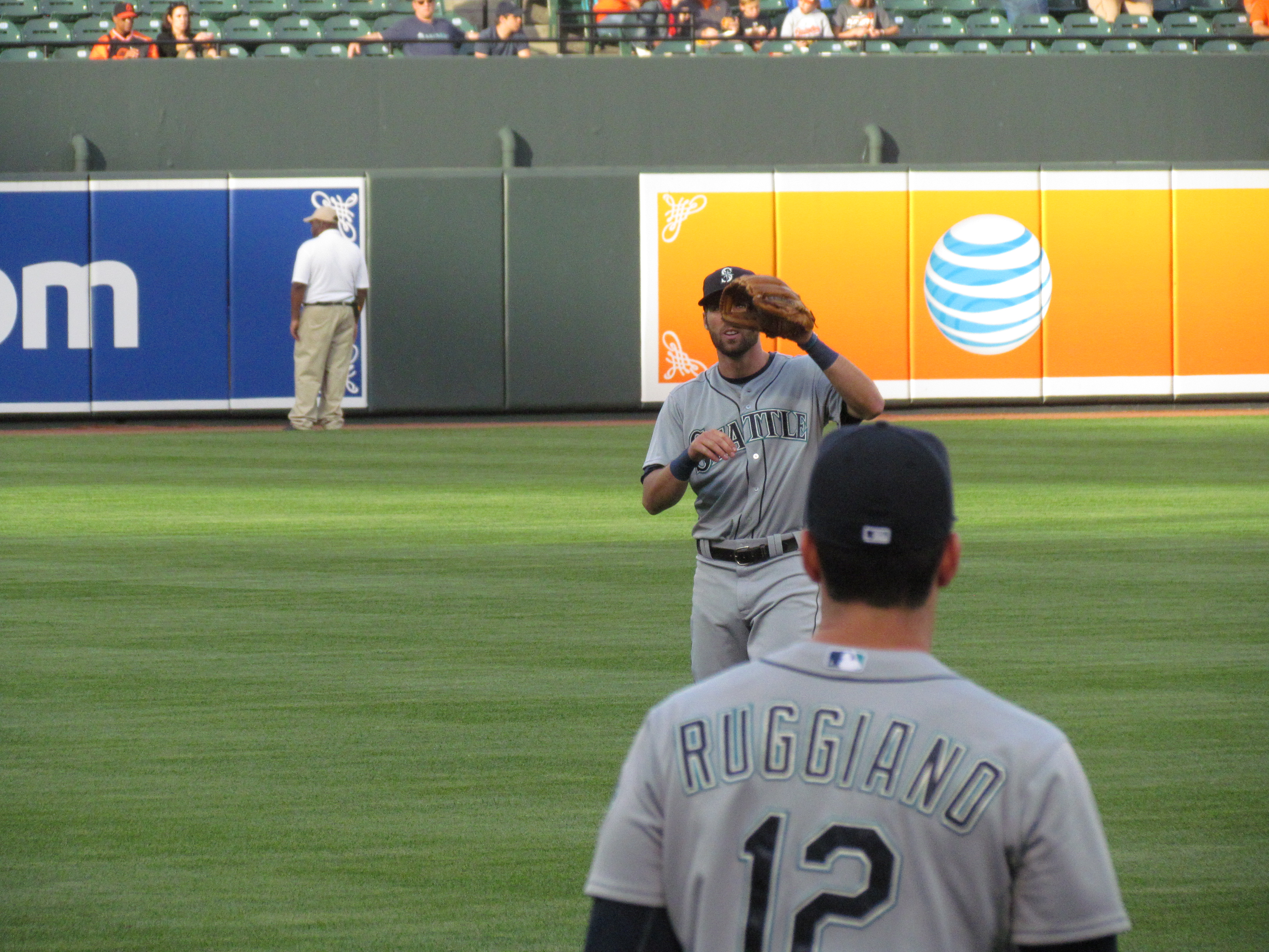 Poor positioning and an overall lack of effort prevented me from getting down to the front row. However, I did benefit. As everyone else was concerned about getting up to Cano, I realized shortstop Chris Taylor (pictured left, facing towards the camera) was finished with his pregame throwing and had a ball in his hand. We made eye contact and I raised my hand (I didn’t have my glove on). Without any verbal prompt, he tossed the ball my way and I caught it uncontested. The same thing happened last year at Safeco Field with Brad Miller. Right place, right time sort of deal.