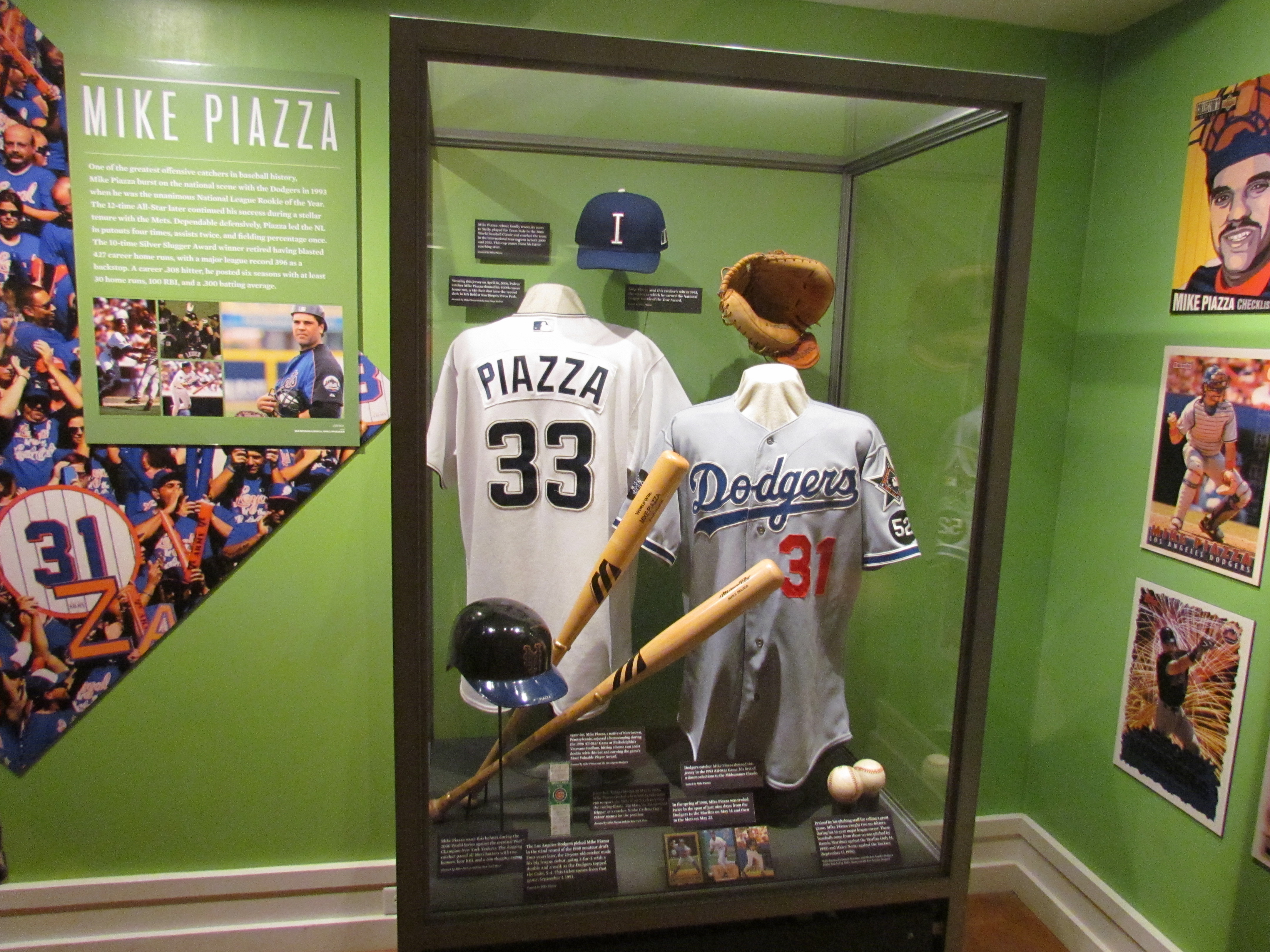 Piazza and Ken Griffey Jr. are the newest members of the Hall, so they have much appreciation currently. The only Marlins Piazza memorabilia I could find were baseball cards— one in the main Piazza case and dozens more upstairs. Apparently, over 120 different baseball card designs of Piazza as a Marlin were produced in his week with the team.