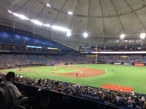 We settled into section 134, along the right field foul line, for the bottom of the second inning. Kevin Kiermaier launched a deep fly ball down the line that, from my perspective, looked to shoot the gap between the top of the foul pole and the outermost catwalk under the dismal canopy of the dome. The ball landed on the walkway behind the right field seats as the first base umpire signaled “foul.”