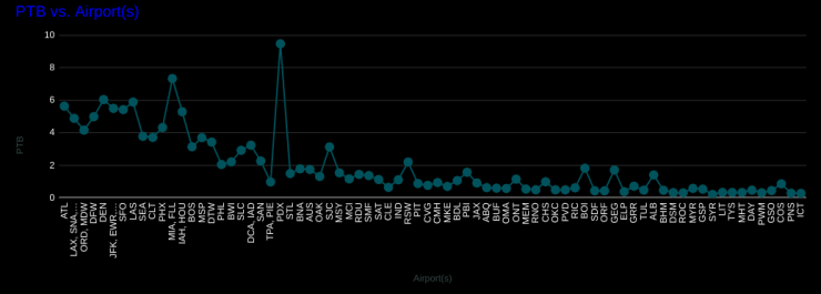 The least-busy MLB city is Milwaukee, ranked 51. Above Milwaukee, but rounding out the four least-busy MLB cities are Cincinnati, Pittsburgh, and Cleveland, which are all rust-belt cities without airline hubs. They have very low PTB’s–around 0.3.
