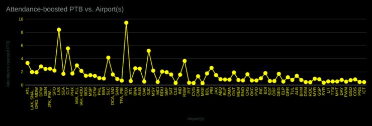 This attendance-adjusted PTB highlights a few cities nicely, though. Namely, Las Vegas, Charlotte, Salt Lake City, and Portland.