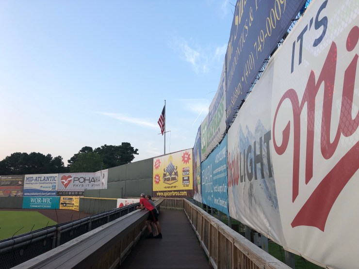 That said, the floor of the boardwalk is hidden by the outfield wall, keeping the structure out of view from the stands. So the view from the infield remains a ubiquitous hodgepodge of billboards separating the outfield from the rural pastures east of Salisbury.