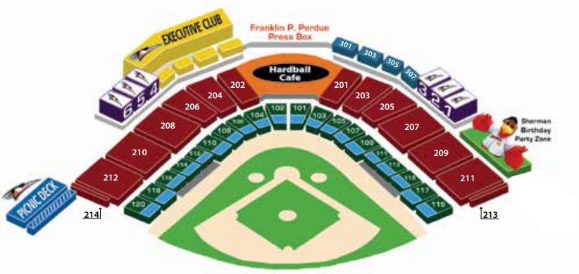 After you have your fill of waterfowl and fried fowl, you’ll have your pick of a number of seating sections inside Perdue Stadium. Reference the Perdue Stadium seating chart above.