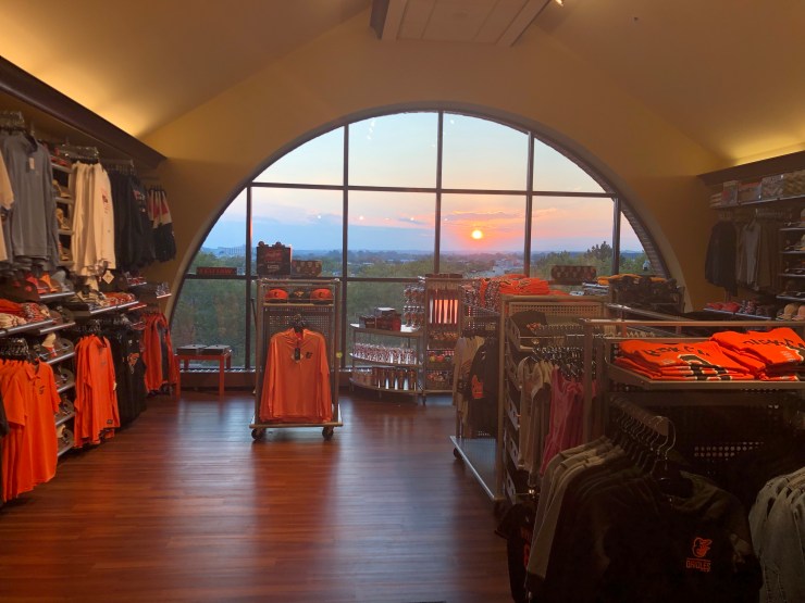 On the 200 level, an enclosed-concourse club, wide semicircular windows look out over Baltimore. Catch a wicked sunset on the third base side, as pictured to the left.