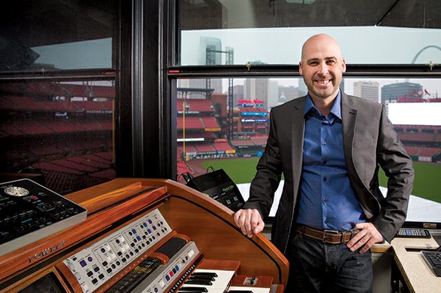 Dwayne Hilton sits in the “central brain” of entertainment at Busch Stadium—a glass-enclosed organ room next to the public address announcer and audio mixer. The St. Louis Cardinals’ organist is entering his 20th season in the booth, platooning organ time with Jeremy Boyer.