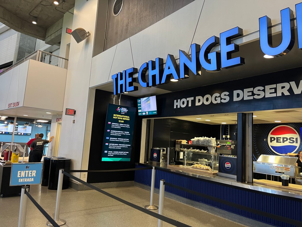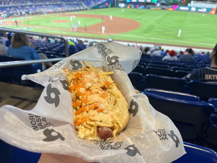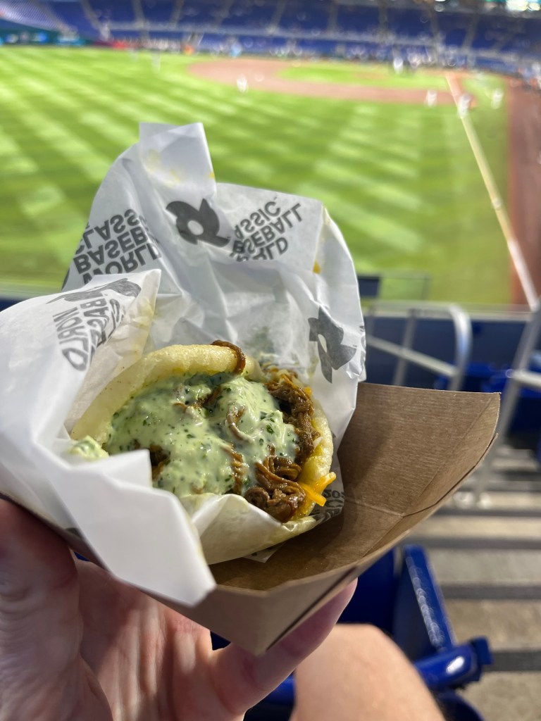 I made my way into the stadium to peruse to cuisine, which featured mostly normal Marlins concessions plus international hot dogs at The Change Up stand. I sampled the Venezuela-inspired “perro con todo,” the dog with everything. Everything, in this case, included onion, cabbage, whatever “pink sauce” is, cotija cheese, and potato chip slices.